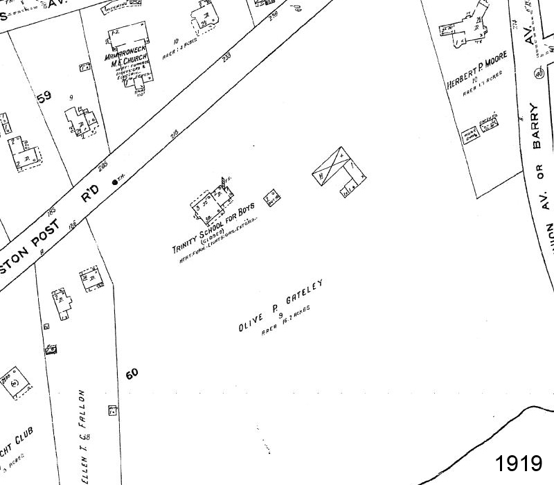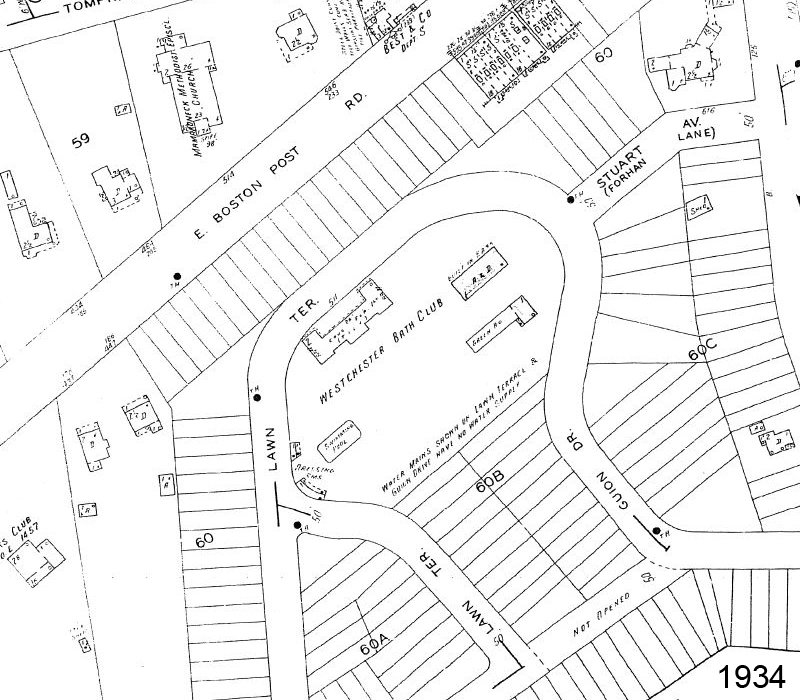 Before 1908, historical maps of our property show mostly undeveloped land and a small two story building with a stable and an additional servant’s quarters. Around 1908, this residence was converted for use as a private school (Trinity School for Boys), which was closed around 1919. Subsequently the property was redeveloped as Westchester Bath Club. This complex consisted of a two-story main building, a residential building, a greenhouse, and a swimming pool with adjacent dressing room structures. By 1952, this land was redeveloped as Lawn Terrace Apartments complex – two L-shaped buildings in the northern portion of the property and a third building along the southern portion of the property. Our property hasn’t significantly changed since 1952.